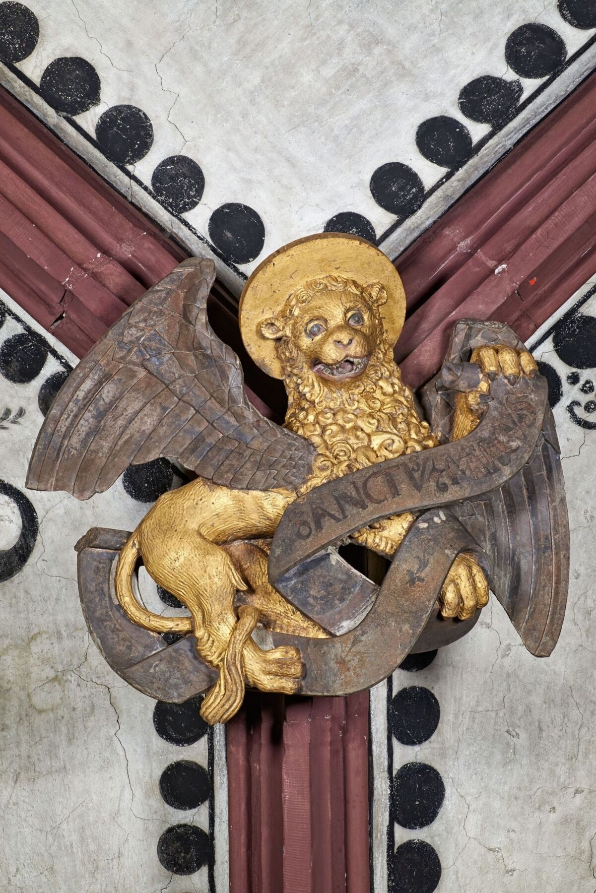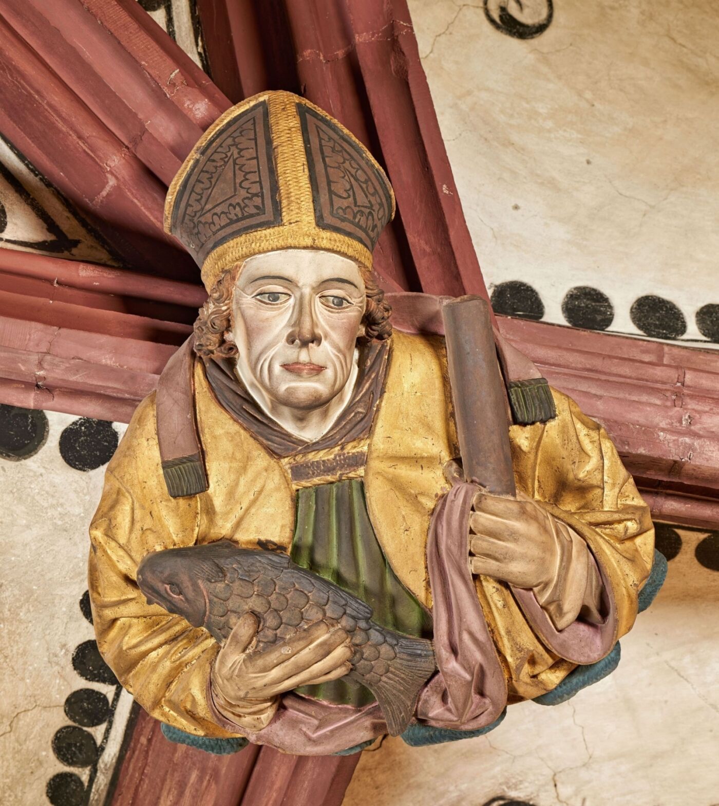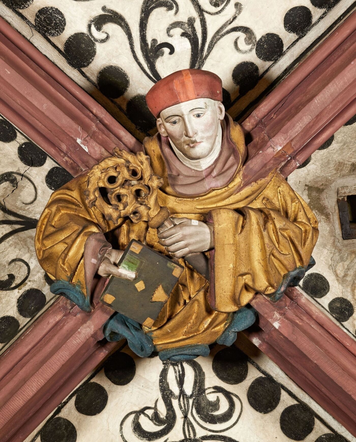 Im Verlauf der seit 2014 laufenden Restaurierungskampagne hatte sich immer deutlicher die überragende architektonische und künstlerische Geltung des «himmlischen Hofs» – dies der Name, der sich seit dem 20. Jahrhundert für das Chorgewölbe eingebürgert hat – herauskristallisiert. 85 überlebensgrosse Heiligenfiguren zieren die Schlusssteine des wunderbaren Rautengewölbes, mit welchem Peter Pfister den Dreiachtelschluss, die zwei schmalen anschliessenden Joche sowie die beiden weiten westlichen Abschnitte zu einer räumlichen und architektonischen Einheit verflochten hat.