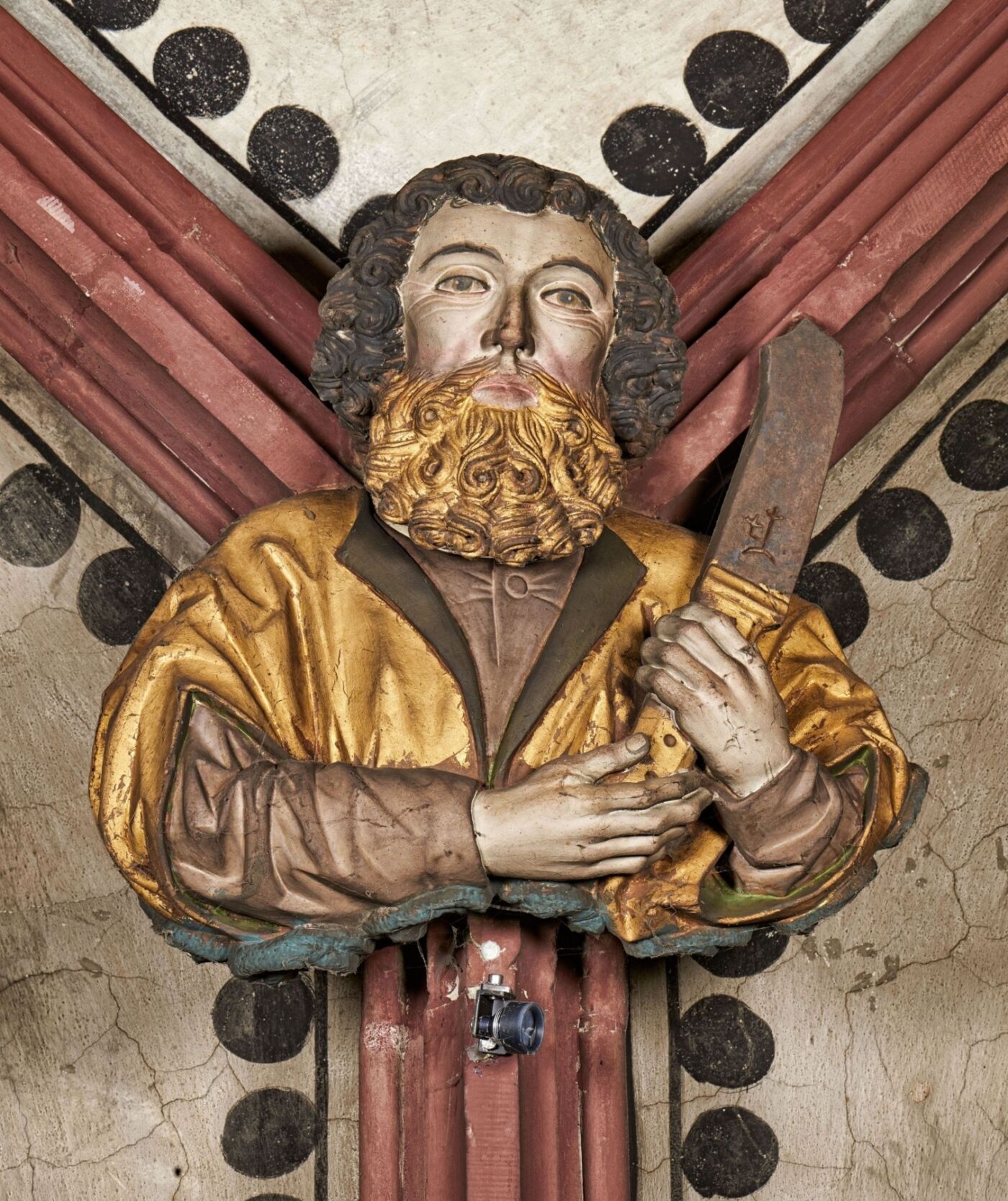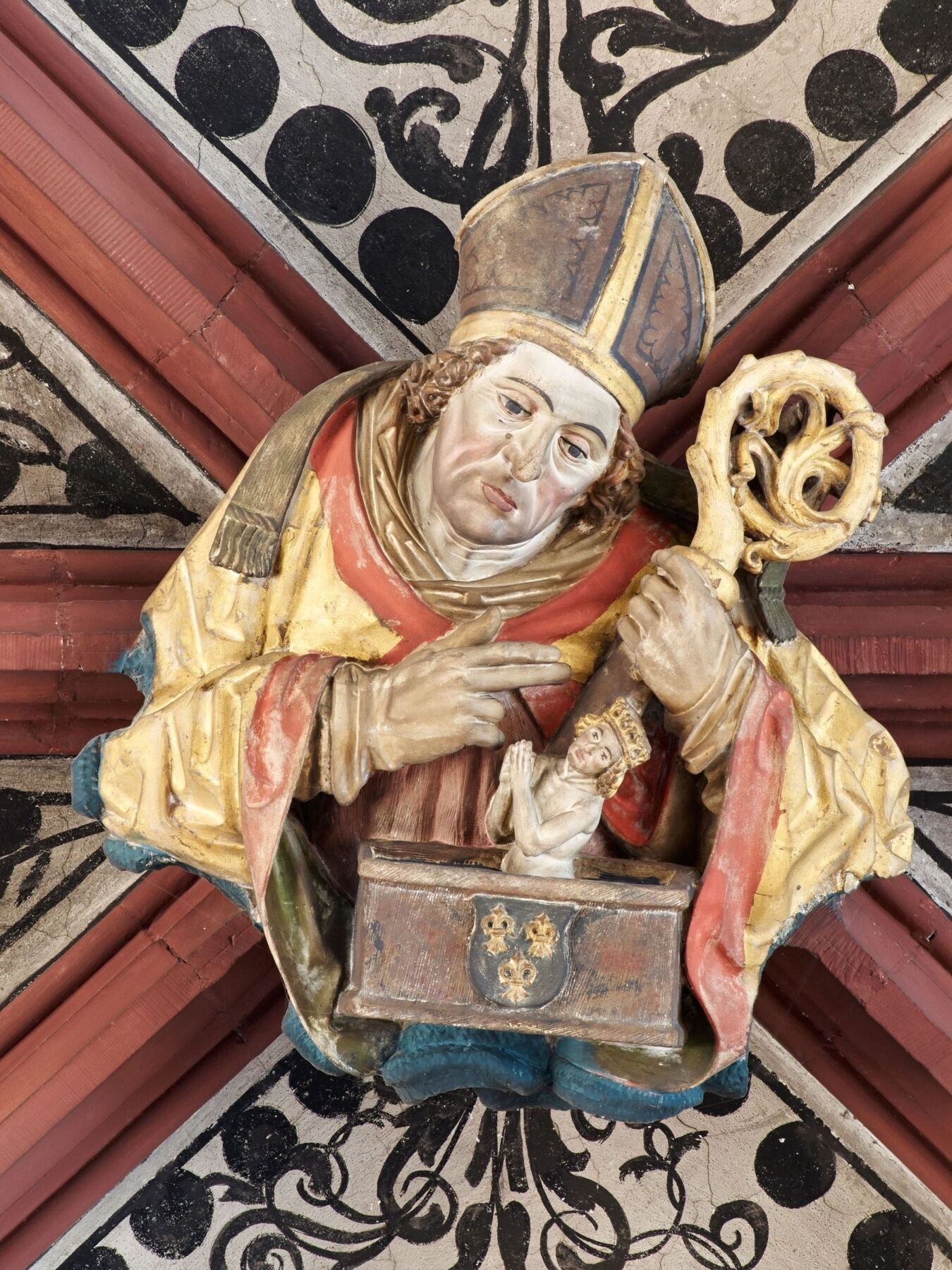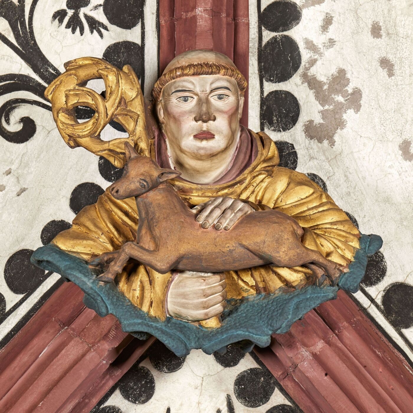 Im Verlauf der seit 2014 laufenden Restaurierungskampagne hatte sich immer deutlicher die überragende architektonische und künstlerische Geltung des «himmlischen Hofs» – dies der Name, der sich seit dem 20. Jahrhundert für das Chorgewölbe eingebürgert hat – herauskristallisiert. 85 überlebensgrosse Heiligenfiguren zieren die Schlusssteine des wunderbaren Rautengewölbes, mit welchem Peter Pfister den Dreiachtelschluss, die zwei schmalen anschliessenden Joche sowie die beiden weiten westlichen Abschnitte zu einer räumlichen und architektonischen Einheit verflochten hat.